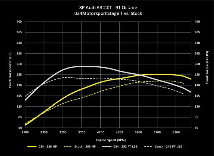 034Motorsport Stage 1 Performance Software for the EA113 2.0T FSI engine is engineered to safely increase horsepower and torque with no hardware modifications required. 034Motorsport's proprietary calibrations increase boost while optimizing timing and fueling maps to extract additional power from the 2.0T FSI engine.