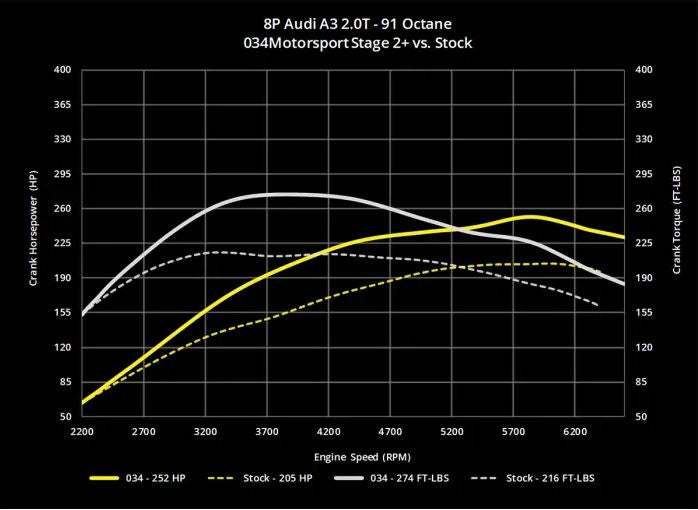 Stage 2+ | 91 Oct | 252 HP | 274 TQ | 48 HP @ 4,400 RPM | 62 TQ @ 4,000 RPM | 7,100 RPM | ∞