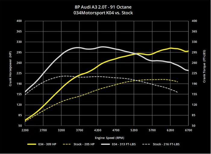 034Motorsport K04 Performance Software for the EA113 2.0T FSI engine is engineered to further increase horsepower and torque with the addition of an 8P Audi S3 2.0T FSI K04 turbocharger, 8P Audi S3 2.0T FSI fuel injectors, high-pressure fuel pump (HPFP) upgrade, 3-bar Map Sensor, high-flow downpipe upgrade, and performance air intake. 034Motorsport's calibrations optimize the factory ECU for these hardware modifications in order to extract additional power from the 2.0T FSI engine.